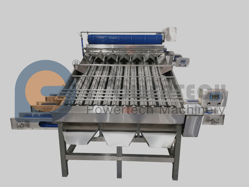 Большое количество сырых креветок транспортируется двухуровневым конвейером, которые расположены в упорядоченном порядке к рабочей поверхности сортировочной машины.Каждые два градуированных круговых ролика вращаются под приводным двигателем, креветки разных размеров сортируются по разным зазорам между каждыми двумя роликами с очень высокой скоростью падения, что соответствует очень высокой скорости сортировки, начиная с самого маленького размера и заканчивая самым большим размера, а затем были собраны после транспортировки.
